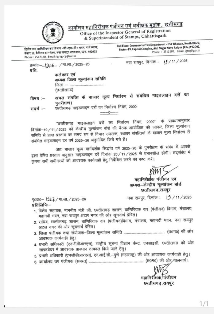 रायपुर। छत्तीसगढ़ में अचल संपत्तियों के बाजार मूल्य निर्धारण से जुड़ी नई गाइडलाइन दरें 20 नवंबर 2025 से प्रभावशील होंगी। इस संबंध में पंजीयन महानिरीक्षक एवं अधीक्षक मुद्रांक कार्यालय ने सभी कलेक्टर सहित संबंधित अधिकारियों को आधिकारिक पत्र जारी किया है। सूत्रों से मिली जानकारी के अनुसार जमीन की नई गाइडलाइन दरों में शहरी क्षेत्रों में 150 से 400 प्रतिशत बढ़ाई गई है। मुख्यमंत्री विष्णुदेव साय की पहल पर 25 साल पुराने जमीन गाइडलाइन मूल्य निर्धारण में बड़ा बदलाव किया गया है। इससे रजिस्ट्री की प्रक्रिया आसान होगी। वहीं भ्रम, विसंगतियां व अतिरिक्त शुल्क भी समाप्त होंगे, जिससे आम जनता को बड़ी राहत मिलेगी।