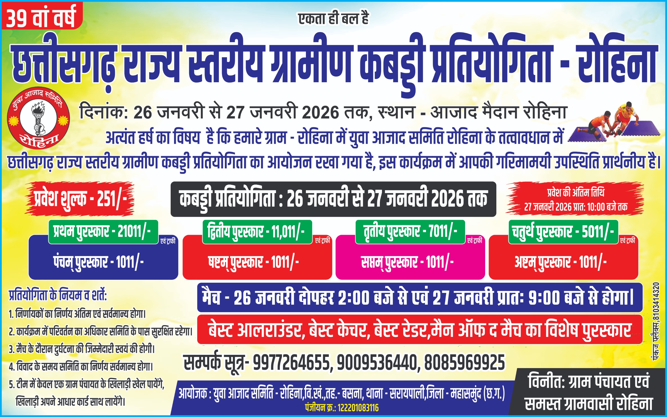 सरायपाली। युवा आजाद समिति रोहिना द्वारा प्रति वर्ष की भांति इस वर्ष 39वें वर्ष में छत्तीसगढ़ राज्य स्तरीय कबड्डी प्रतियोगिता का आयोजन 26 जनवरी से 27 जनवरी तक किया जा रहा है। प्रतियोगिता का शुभारंभ 26 जनवरी को दोपहर 2 बजे सम्पन होगा ,जिसमें मुख्य अतिथि के रूप में श्रीमती चातुरी नन्द विधायक सरायपाली ,अध्यक्षता धनुर्जय मरकाम सरपंच ग्राम पंचायत रोहिना,विशिष्ट अतिथि घसिया सिदार सदस्य जनपद पंचायत बसना,कालिंदी मुन्ना अग्रवाल जनपद सदस्य,सादराम अजय शिक्षक ,अजय जायसवाल प्राचार्य हाई स्कूल रोहिना,बनितराम सिदार अध्यक्ष सहकारी सेवा समिति रोहिना,इंद्रजीत बरिहा सरपंच सागरपाली,रोहित पटेल सरपंच लोहरिनडीपा,मौना पटेल सरपंच दुर्गापाली,उसत कुमार सचिव रोहिना होंगे।
