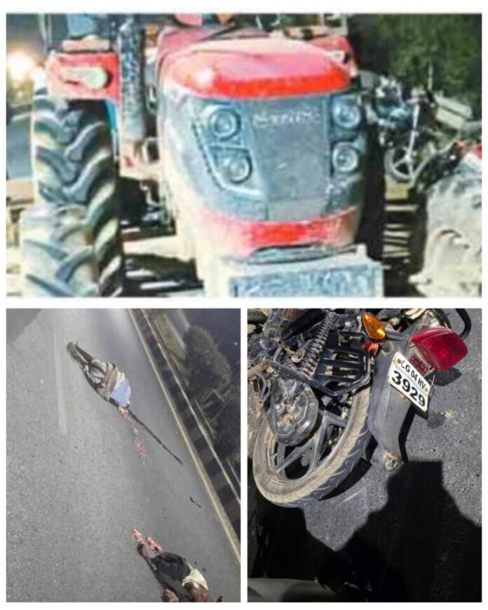 सरायपाली/बसना। राष्ट्रीय राजमार्ग-53 पर गुरुवार रात एक भीषण सड़क हादसा हो गया, हादसे में बाइक चालक और पीछे बैठे एक बुजुर्ग की मौके पर ही मौत हो गई। तेज रफ्तार बाइक सड़क किनारे खड़े ट्रैक्टर में लगे रोटावेटर से टकरा गई। टक्कर के बाद दोनों सड़क पर गिर पड़े, तभी पीछे से आ रहे ट्रक ने उन्हें कुचल दिया, जिससे दोनों ने घटनास्थल पर ही दम तोड़ दिया।