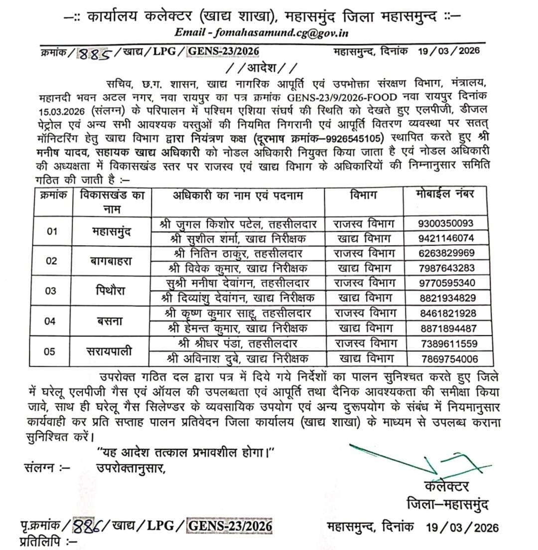 पश्चिम एशिया संघर्ष की स्थिति को देखते हुए एलपीजी, डीजल पेट्रोल एवं सभी आवश्यक वस्तुओं के नियमित निगरानी एवं आपूर्ति वितरण व्यवस्था पर सतत मॉनिटरिंग हेतु खाद्य विभाग द्वारा नियंत्रण कक्ष स्थापित करते हुए श्री मनीष यादव सहायक खाद्य अधिकारी को नोडल अधिकारी नियुक्त किया गया है साथ ही मॉडल अधिकारी की अध्यक्षता में विकासखंड स्तर पर राजस्व एवं खाद्य विभाग के अधिकारीगणों के नाम शामिल है।