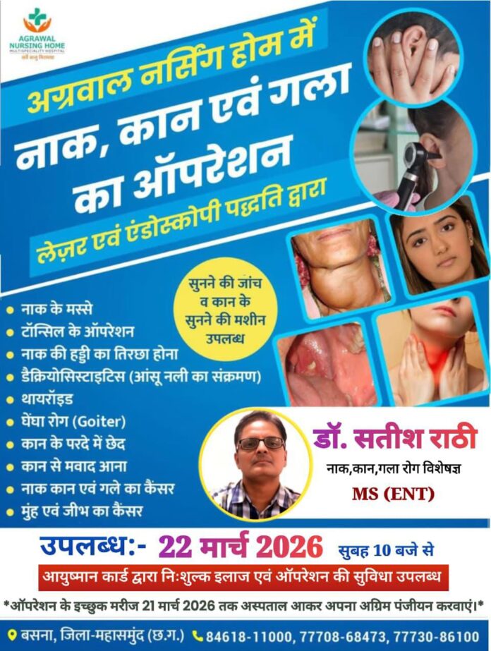 अग्रवाल नर्सिंग होम में नाक, कान एवं गला का ऑपरेशन लेज़र एवं एंडोस्कोपी पद्धति द्वारा