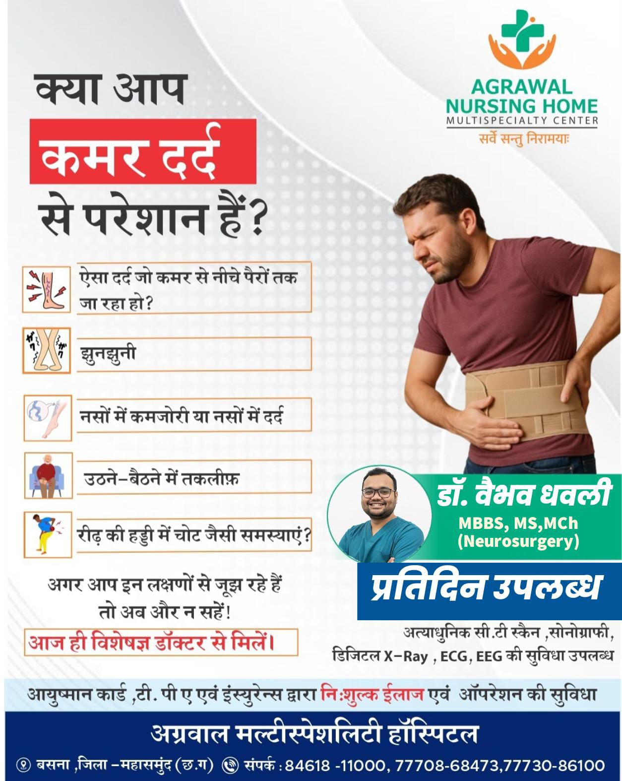 बसना। अग्रवाल नर्सिंग होम मल्टीस्पेशलिटी में कमर दर्द से परेशान लोगों के लिए विशेषज्ञ डॉ. वैभव धवली (MBBS, MS, MCh – न्यूरोसर्जरी) की सेवाएं देंगें।।