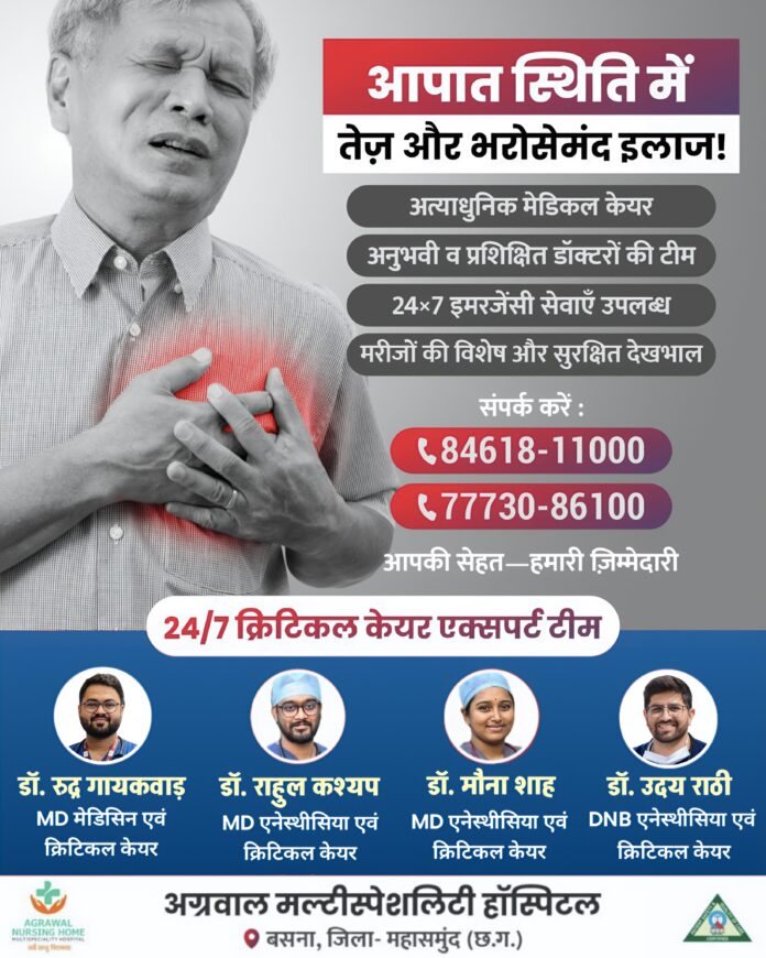 बसना, महासमुंद* – अग्रवाल मल्टीस्पेशलिटी हॉस्पिटल, बसना द्वारा मरीजों को आपात स्थिति में तेज और भरोसेमंद इलाज उपलब्ध कराने के लिए 24×7 क्रिटिकल केयर एक्सपर्ट टीम की सुविधा शुरू की गई है।