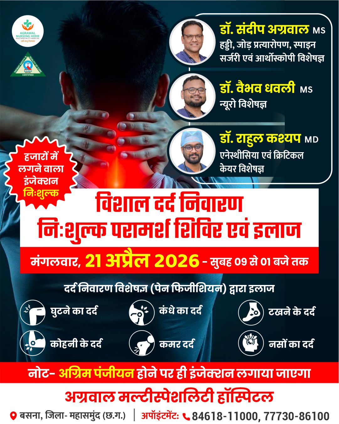 बसना, महासमुंद – अग्रवाल मल्टीस्पेशलिटी हॉस्पिटल, बसना द्वारा 21 अप्रैल 2026, मंगलवार को सुबह 09 बजे से दोपहर 01 बजे तक विशाल दर्द निवारण निःशुल्क परामर्श शिविर एवं इलाज का आयोजन किया जा रहा है।