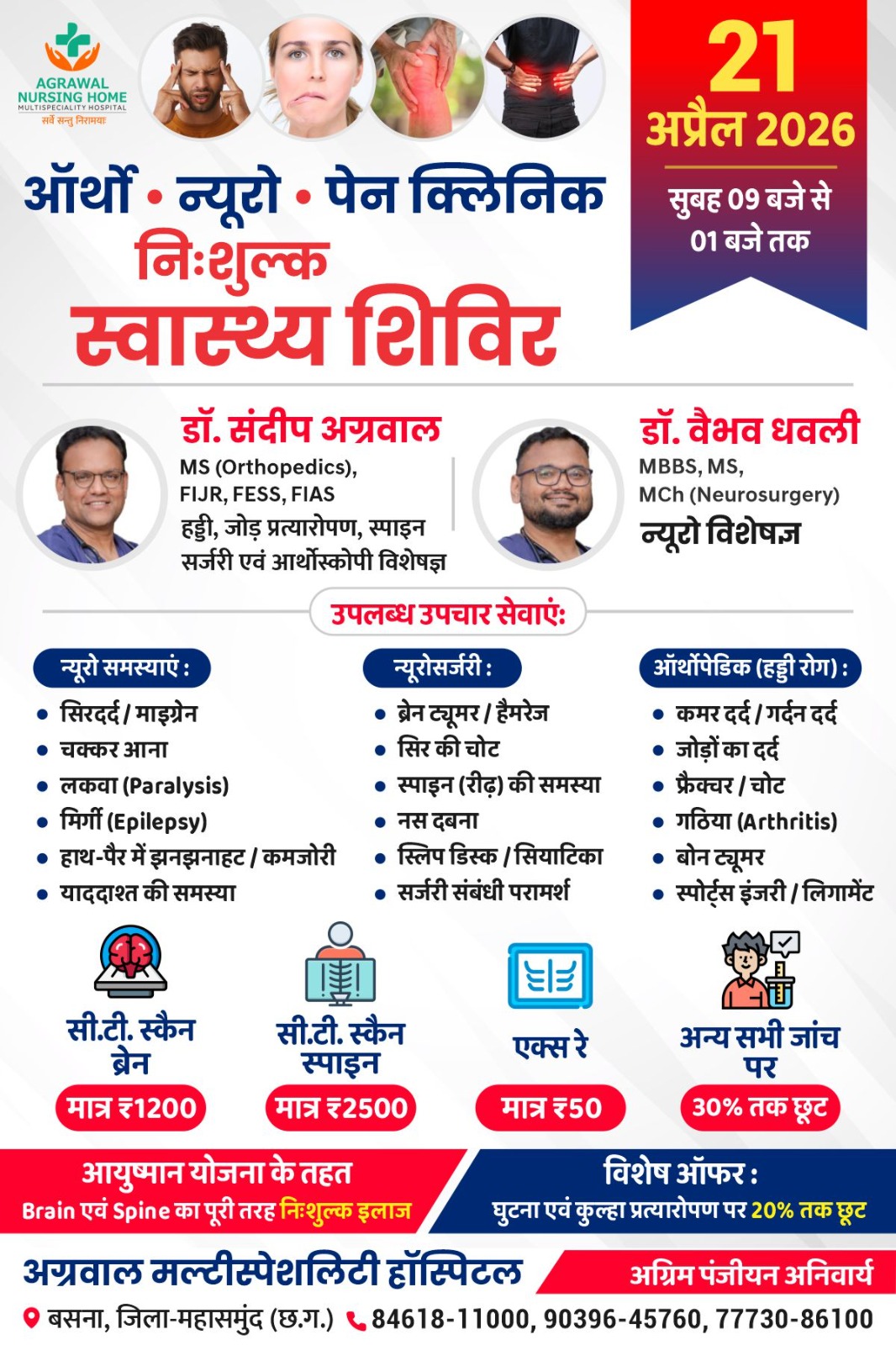 बसना, महासमुंद – अग्रवाल नर्सिंग होम मल्टीस्पेशलिटी हॉस्पिटल, बसना द्वारा 21 अप्रैल 2026 को सुबह 09 बजे से दोपहर 01 बजे तक ऑर्थो, न्यूरो, पेन क्लिनिक निःशुल्क स्वास्थ्य शिविर का आयोजन किया जा रहा है।
